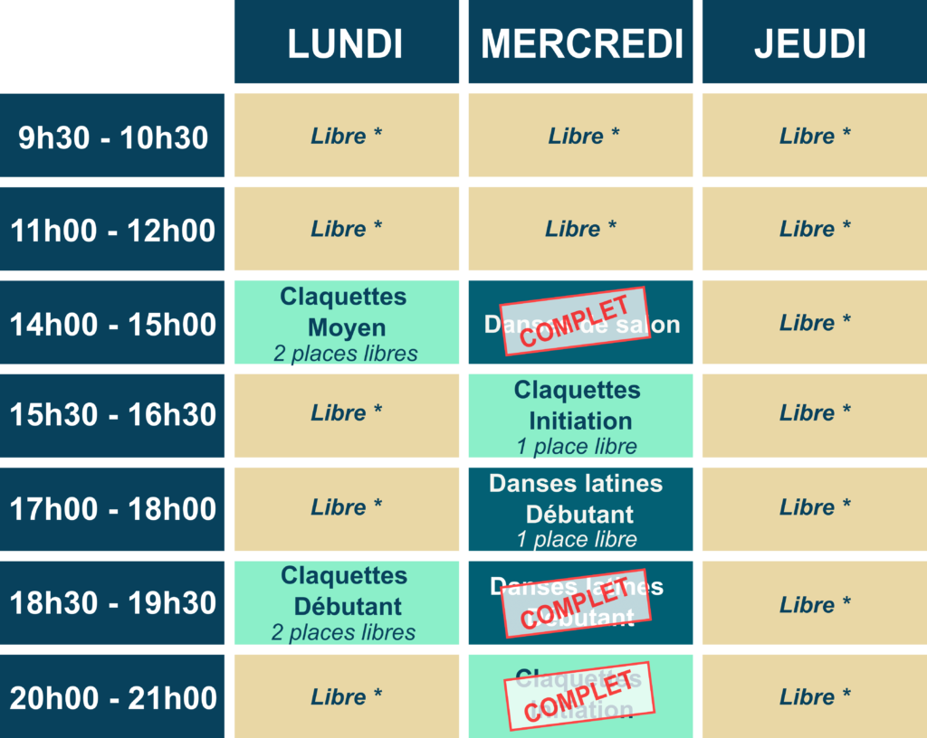*Concernant les cours entièrement libres, le style de danse sera attribué ultérieurement selon les réservations.