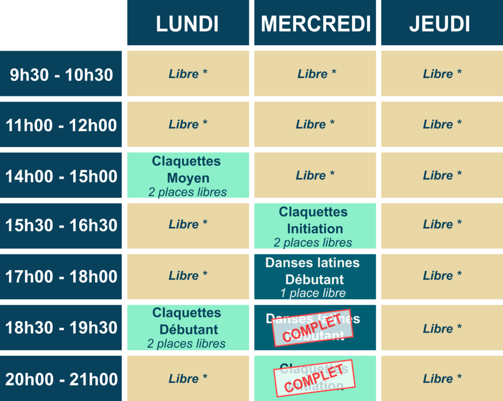 Les cours collectifs sont limités à 4 places pour les cours de Claquettes et 3 places pour les cours de Danses latines, dans le but d’assurer le confort optimal aux danseuses et danseurs dans l’apprentissage des mouvements.